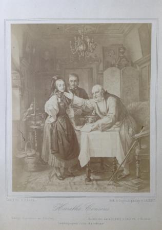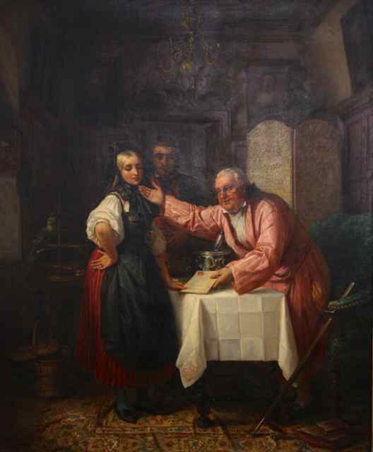Der Heiraths-Consens (1852, Öl auf Leinwand, 96 x 79 cm, signiert). Das Bild befindet sich im Privatbesitz der Familie.