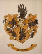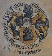 Das Wappen der Familie Flüggen, das von Petrus Johannes Flüggen (1778 – 1855), dem Vater von Gisbert Flüggen, in Auftrag gegeben wurde. In dem Wappen trägt er den Namen J. Peter Flieggen. Dass bei der Zeichnung (links) und der Hinterglasmalerei (Mitte) der Name nicht mit “ü” sondern mit “ie” geschrieben wird, kann nur ein Versehen sein, da der Familienname in dieser Variante nirgendwo auftaucht. Im Namensband des von Elly Untermann nach einer Wappenvorlage 2011 in Acryl gemalten Wappens (rechts) ist der Name korrekt.