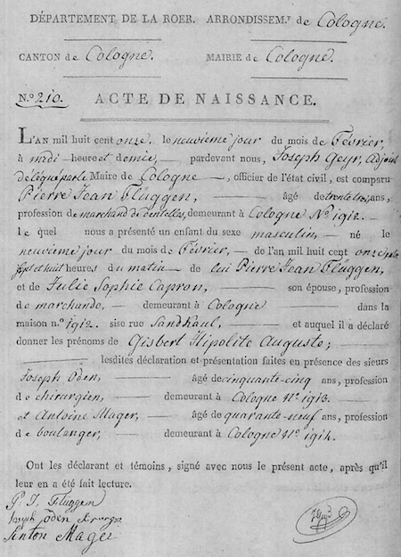 Nachdem Gisbert Flüggen eine kurze Zeit in Gent in Flandern gelebt hatte, wählte er nach Angaben der “Illustrirten Zeitung” im Jahre 1832 München zu seinem ständigen Aufenthaltsort. Am 24. Oktober 1833 schrieb er sich dort an der Akademie der Bildenden Künste ein, die zu dieser Zeit einen weltweit führenden Ruf genoss. Gleichzeitig war er aber auch noch in Köln, wo am 5. November 1834 die Ehe mit der Friseurin Catharina Hölzgen geschlossen wurde. Sie wurde am 2. Januar 1815 in der Domstadt geboren und entstammte einer Kölner Familienreihe Hölzgen / Trips, die sich bis 1732 nachweisen lässt. Zum Zeitpunkt der Eheschließung war Gisbert 23 Jahre, Catharina 19 Jahre alt.